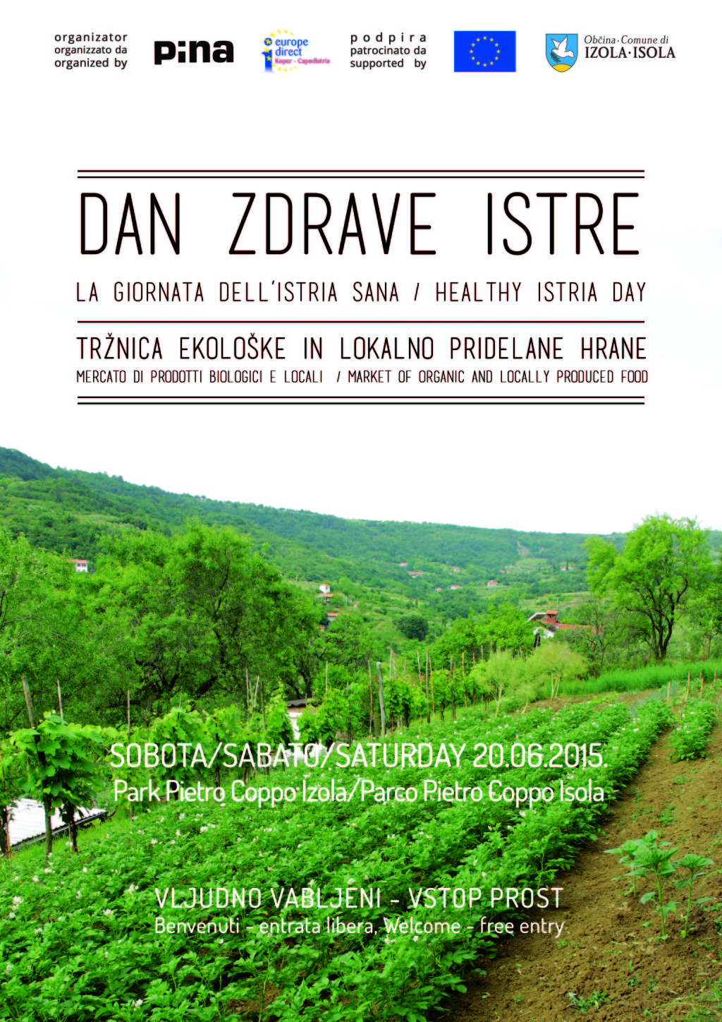 Sobota, 20. junij 2015 / 8.00-13.00 / Park Pietro Coppo, Izola Na prireditvi se bodo v sklopu tržnice ekološke in lokalno pridelane hrane predstavili: Pridelovalci kmetijskih izdelkov iz slovenske in hrvaške Istre (lokalni, zdravi pridelki). Stojnice bodo ponujale izdelke za prodajo ter degustacijo doma pripravljene hrane. Neprofitne organizacije, ki delujejo